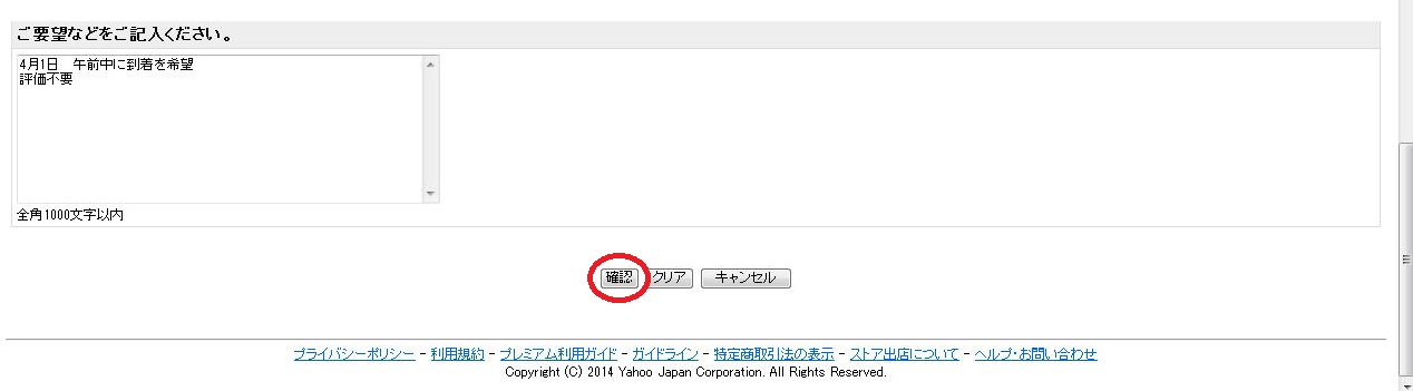 商品の配達日時の指定や、評価不要などあったらご要望欄でお知らせください。 ※ なにも記載がなければ、発送と同時に評価をさせていただきます。評価不要の方は必ずこのご要望欄にてその旨お知らせください。 同梱包の申告もこちらで行ってください。 ※ 同梱包には条件がございます。ご利用規約(免責事項)をお読みください。 すべてを書き終えたら赤丸で囲った確認ボタンをクリックし、次の「ストアオークション オーダーフォーム 入力内容確認」ページへ飛んでください。 ![]() |
